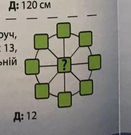 У кожній із дев'яти клітинок фігури , зображеної на малюнку праворуч , 15 записане число так , що сума трьох чисел кожному діаметрі дорівнює 13 , а сума восьми чисел на колі дорівнює 40. Яке число записане в центральній клітинці ? А : 3 Б : 5 B : 8 Г : 10 Д : 12
