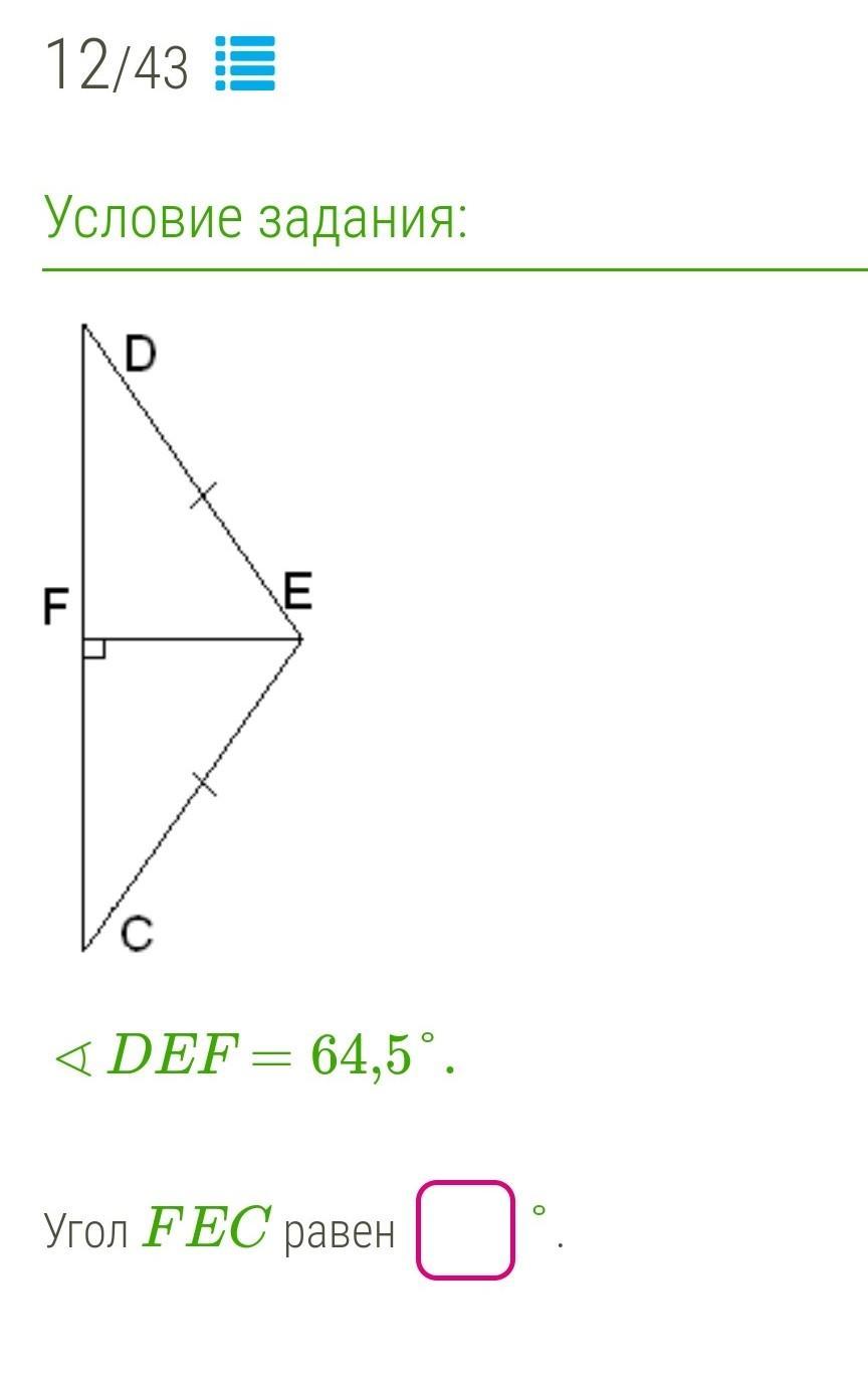 угол FEC равен углу DEF, тогда угол FEC равен 64,5°