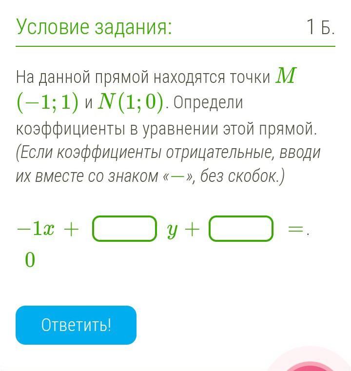 На данной прямой находятся точки M(−1;1) и N(1;0). Определи коэффициенты в уравнении этой прямой. (Если коэффициенты отрицательные, вводи их вместе со знаком «−», без скобок.)