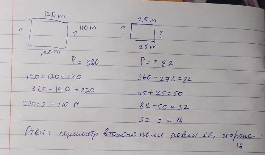 одна сторона футбольного поля равна 120 метров. Периметр этого поля 360 метров, найдите вторую сторону