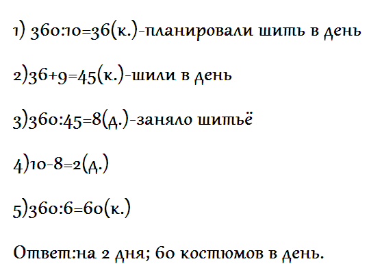 За 10 дней швейная фабрика должна сшить 360 костюмов. Однако на фабрике ежедневно шили на 9 костюмов больше. На сколько дней раньше запланированного швейная фабрика выполнила задание?Сколько костюмов нужно шить на фабрике ежедневно, чтобы закончить работу за 6 дней?