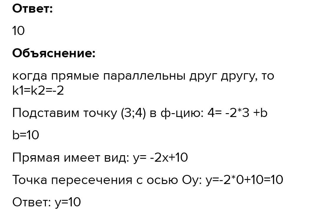 Прямая у = кх + b проходит через точку (3;4) и параллельна прямой у = - 2x + 3. Найти ординату точки пересечения прямой у = kx + b с осью O