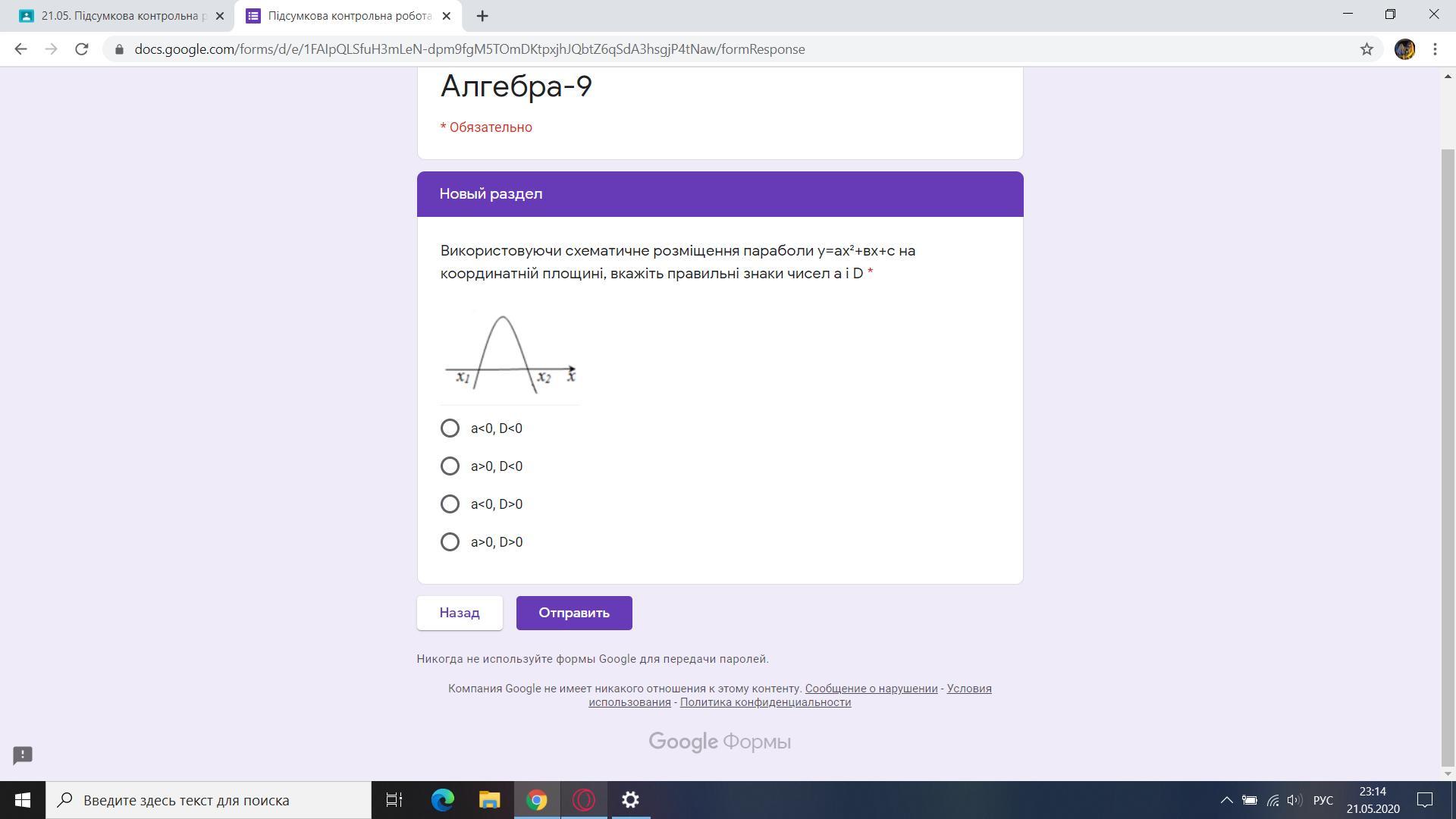 Я украинский не знаю, но задание в принципе понял, так как ветки направлены вниз, а<0, так как как есть два пересечения с осью ОХ, то дискриминант положительный, следовательно, подходит вариант 3