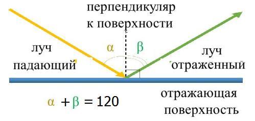 Луч света падает на плоскую границу раздела двух сред. Угол между отраженным и падающим лучом 120°. Чему равен угол падения и отражения? Сделайте по условию рисунок.