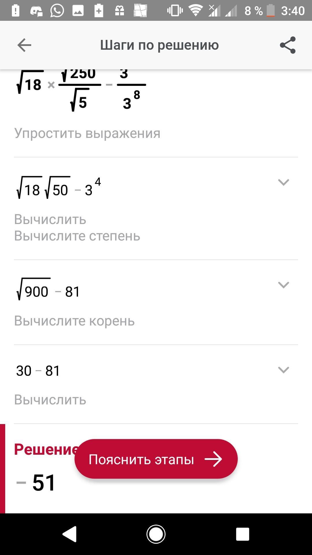 во втором случае 250/5 и это корень из 50, потом умножаем его на корень из 18 и получаем корень из 900 = 30, ну а дальше 30-3в 4 степени= 30-81=-51