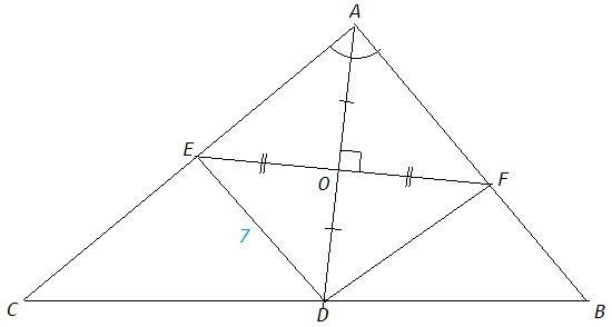 AD - биссектриса и высота (AD⊥EF), следовательно и медиана, EO=OF (△EAF - равнобедренный). EAFD - ромб (диагонали перпендикулярны и точкой пересечения делятся пополам), AF=DE=7