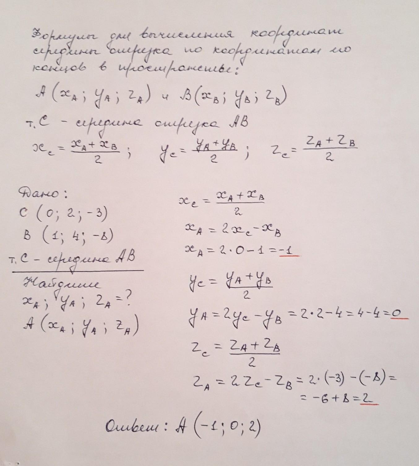 Точка С – середина отрезка АВ. Найдите координаты точки А, если С(0; 2; -3), В(1; 4; -8).