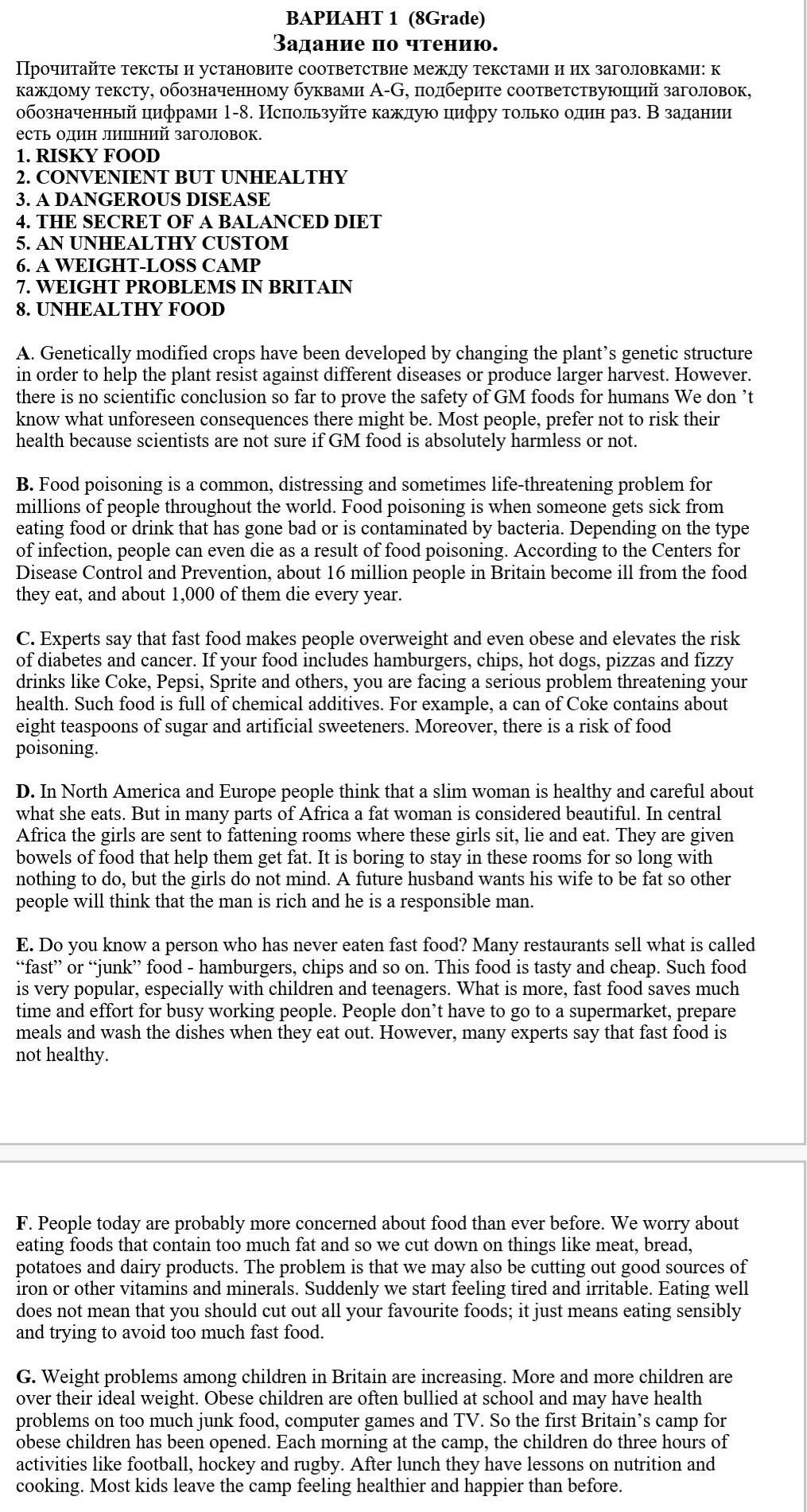 Прочитайте тексты и установите соответствие между текстами и их заголовками: к каждому тексту, обозначенному буквами А-G, подберите соответствующий заголовок, обозначенный цифрами 1-8. Используйте каждую цифру только один раз. В задании есть один лишний заголовок.