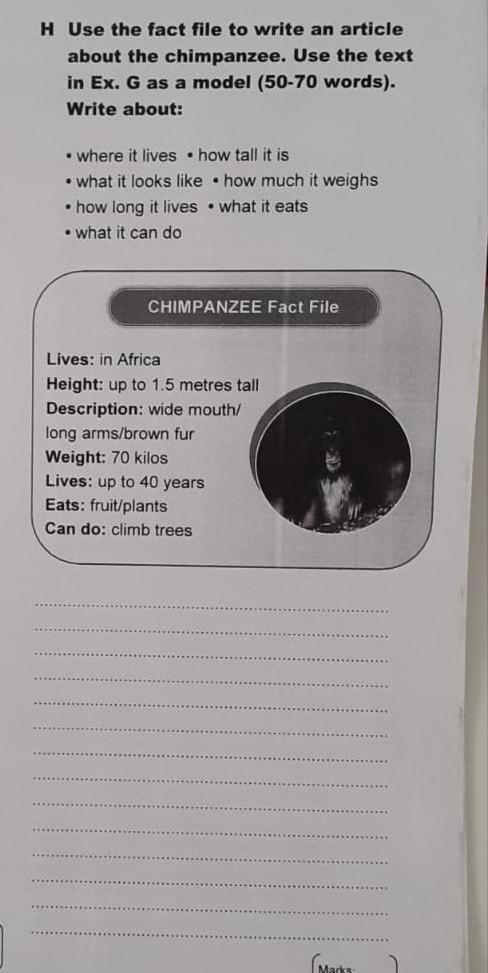 Ответ:Chimpanzee are of different size, shape and colours. Chimpanzee has four hands and a long tail. It uses its two hind limbs as its hands to eat, to play and to take care of its kids. The diet of chimpanzee includes nuts, berries and fruits. Its favourite fruit is banana. It lives in jungle and jump from tree to tree. Chimpanzee are also used by the people for the Circus performances.