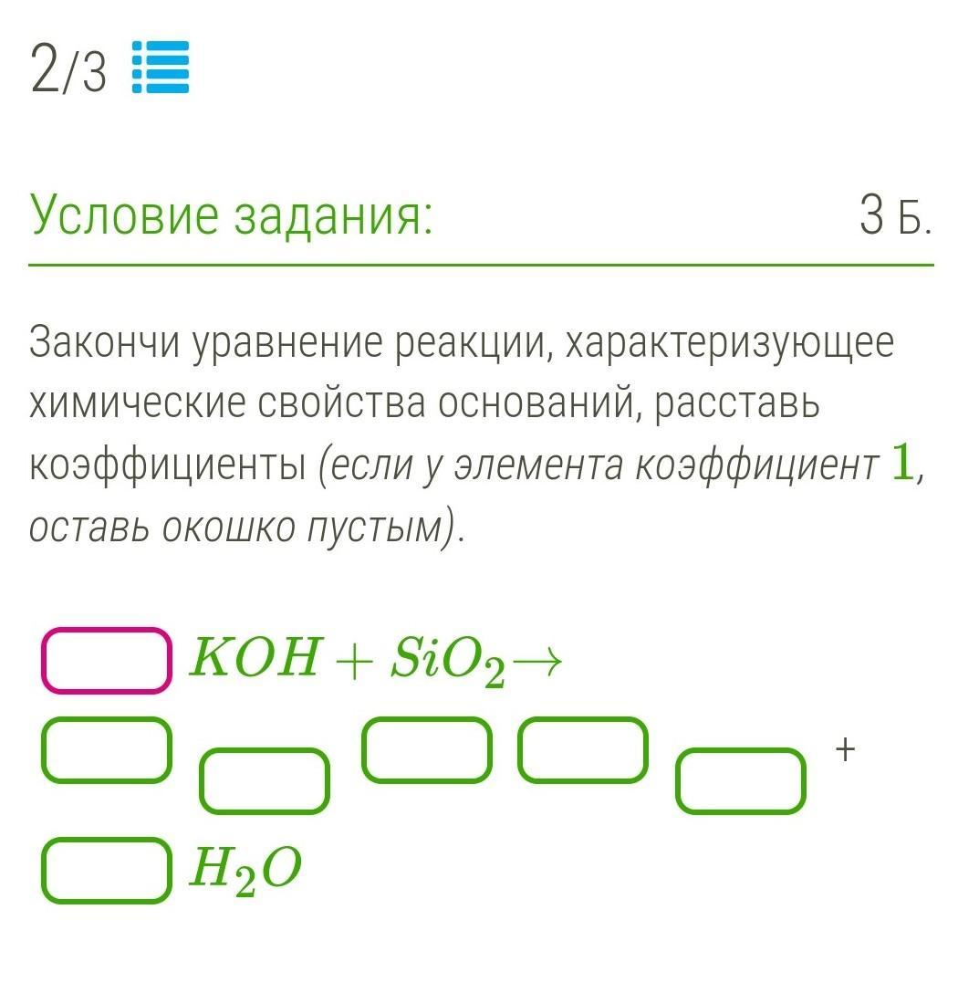 Закончи уравнение реакции, характеризующее химические свойства оснований, расставь коэффициенты (если у элемента коэффициент 1, оставь окошко пустым)