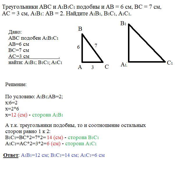 Трикутники ABC і А1В1С1 подібні і АВ = 6 см, ВС = 7 см, АС = 3 см, A1B1 : АВ =2. Знайдіть А1В1, В1С1, А1С1