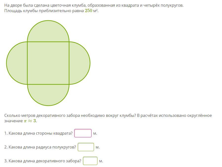Сколько метров декоративного забора необходимо вокруг клумбы? В расчётах использовано округлённое значение π≈3.