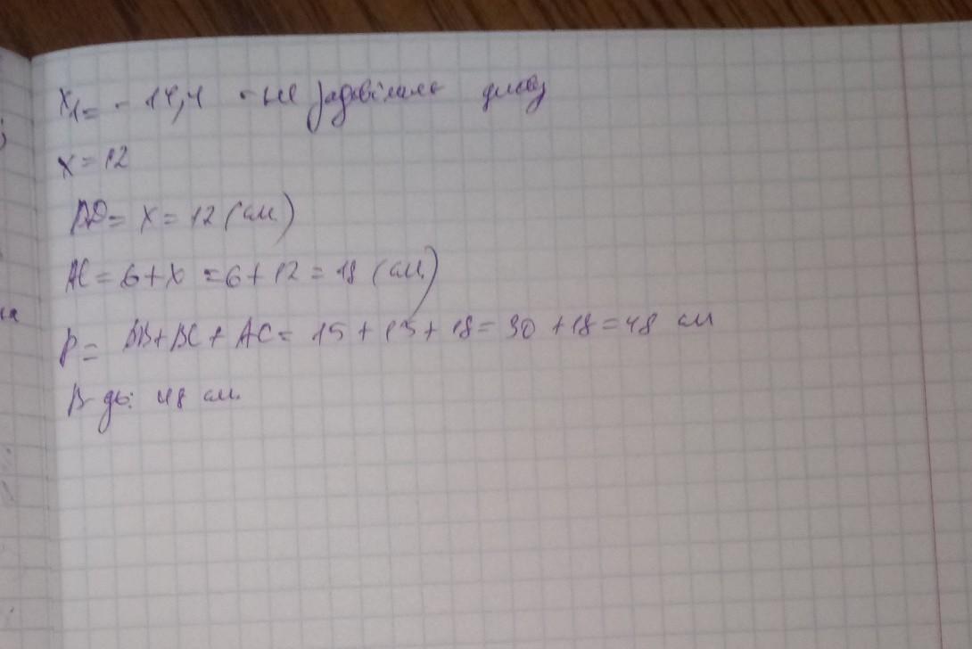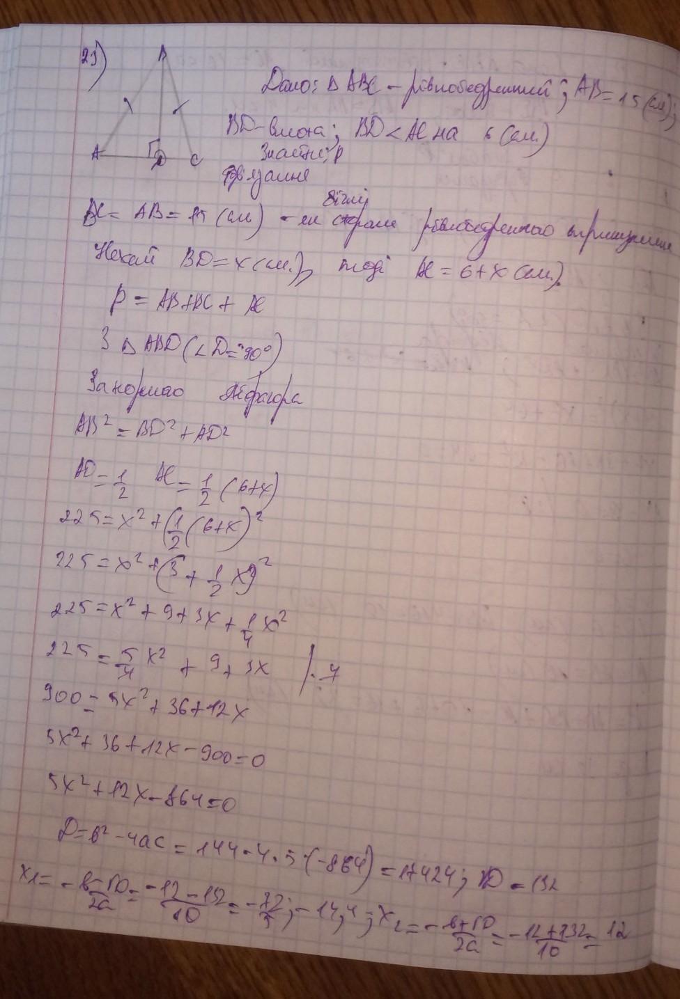 бічна сторона рівнобедреного трикутника дорівнює 15 см а висота проведена до основи на 6 см менша від основи знайдіть периметр цього трикутника
