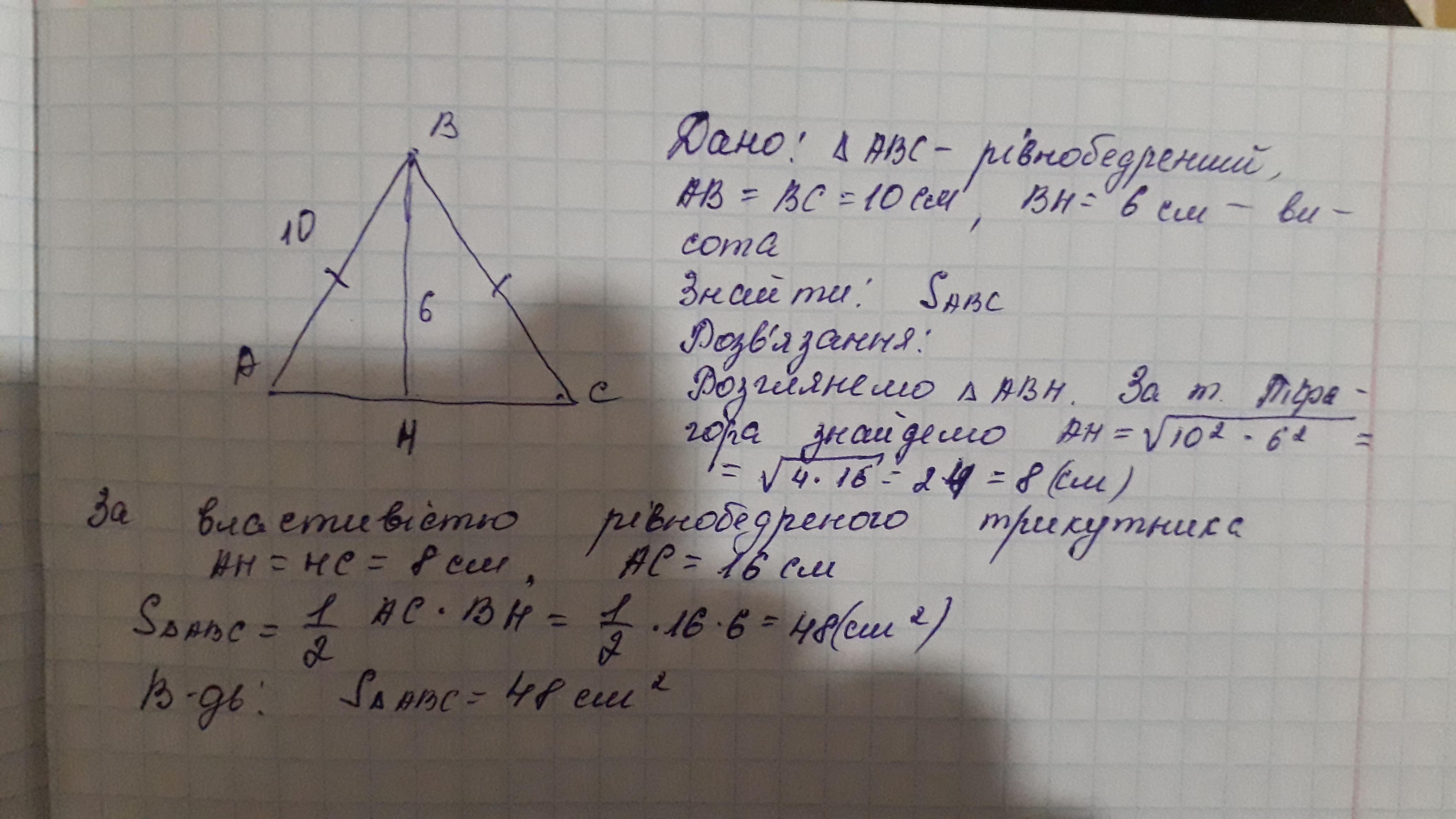 Обчисліть площу рівнобедреного трикутника, бічна сторона якого дорівнює 10 см, а висота, проведена до основи - 6 см. *