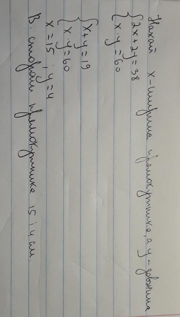 Знайдіть сторони прямокутника якщо його переметр дор. 38 см а площа 60 см2.