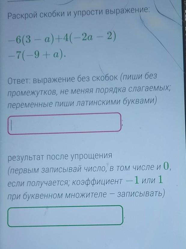 Ответ:-6(3-а)+4(-2а-2)-7(-9+а)= - 18+6а-8а-8+63-7а=37-9а
