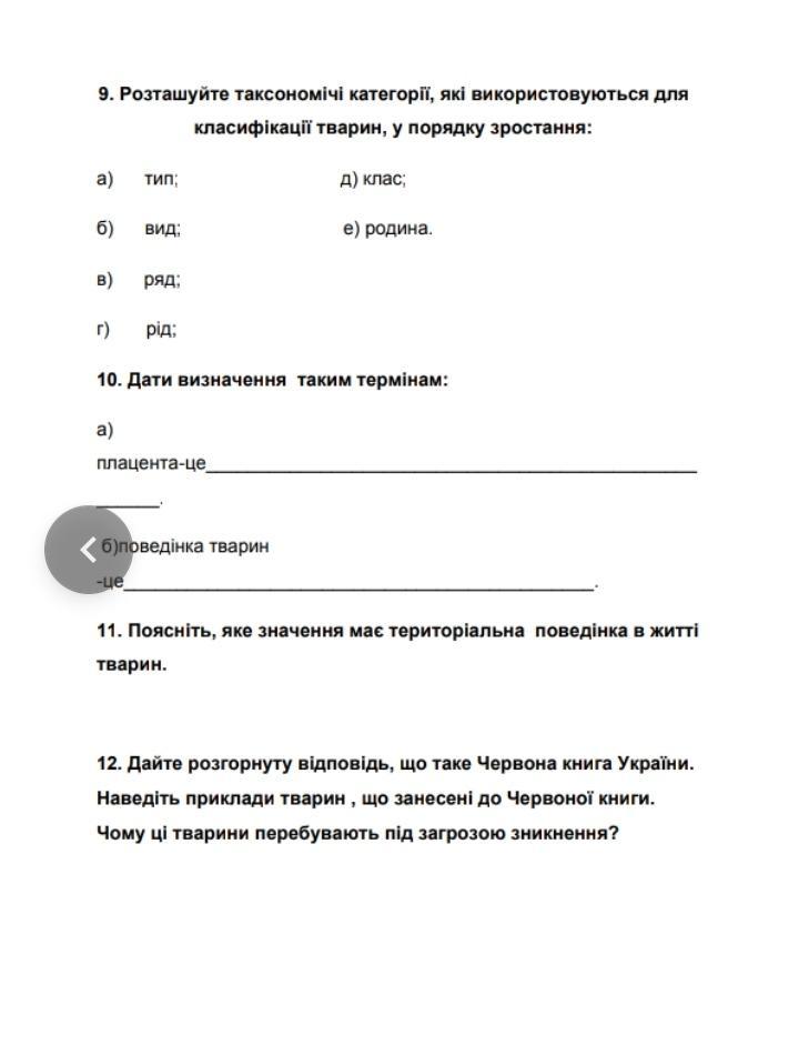 11.ТЕРИТОРІАЛЬНА ПОВЕДІНКА - це сукупність поведінкових реакцій особин, спрямованих на використання ресурсів їхньої території існування (їжі, води, місць відпочинку). Територіальна поведінка властива багатьом безхребетним (крабам, цвіркунам, суспільним павукам) та хребетним (кораловим рибам, жабам, ігуанам, птахам, копитним ссавцям, морським ссавцям, приматам). Території бувають великі, малі й зовсім малі. Усе залежить від виду тварин, їх розмірів і від того, як вони здобувають їжу.Територіальна поведінка включає дії, спрямовані на визначення меж ділянки, їх маркування, охорону від інших особин та облаштування територія.