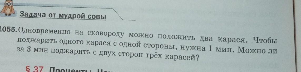 Нельзя, потому что за 2 минуты можно поджарить двух карасей с двух сторон, еще за 1 минуту успеем поджарить третьего карася только с одной стороны, значит за 3 минуты поджарим двух карасей с двух сторон и одного карася с одной стороны, таким образом не получится поджарить трех карасей с двух сторон.