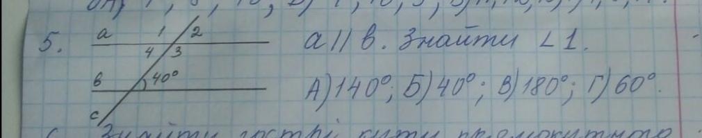 далее угол 2 и угол 4 вертикальны => угол 4 = 140 градусам теперь угол 4 и 1 смежные => 180-140=40 угол 1 =40 p.s. это не точно!!!