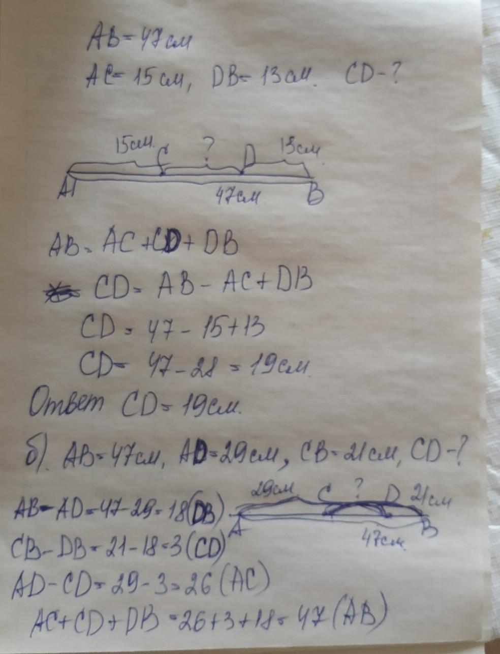 Длина отрезка АВ равна 47 см. Точки С и D лежат на отрезке АВ,