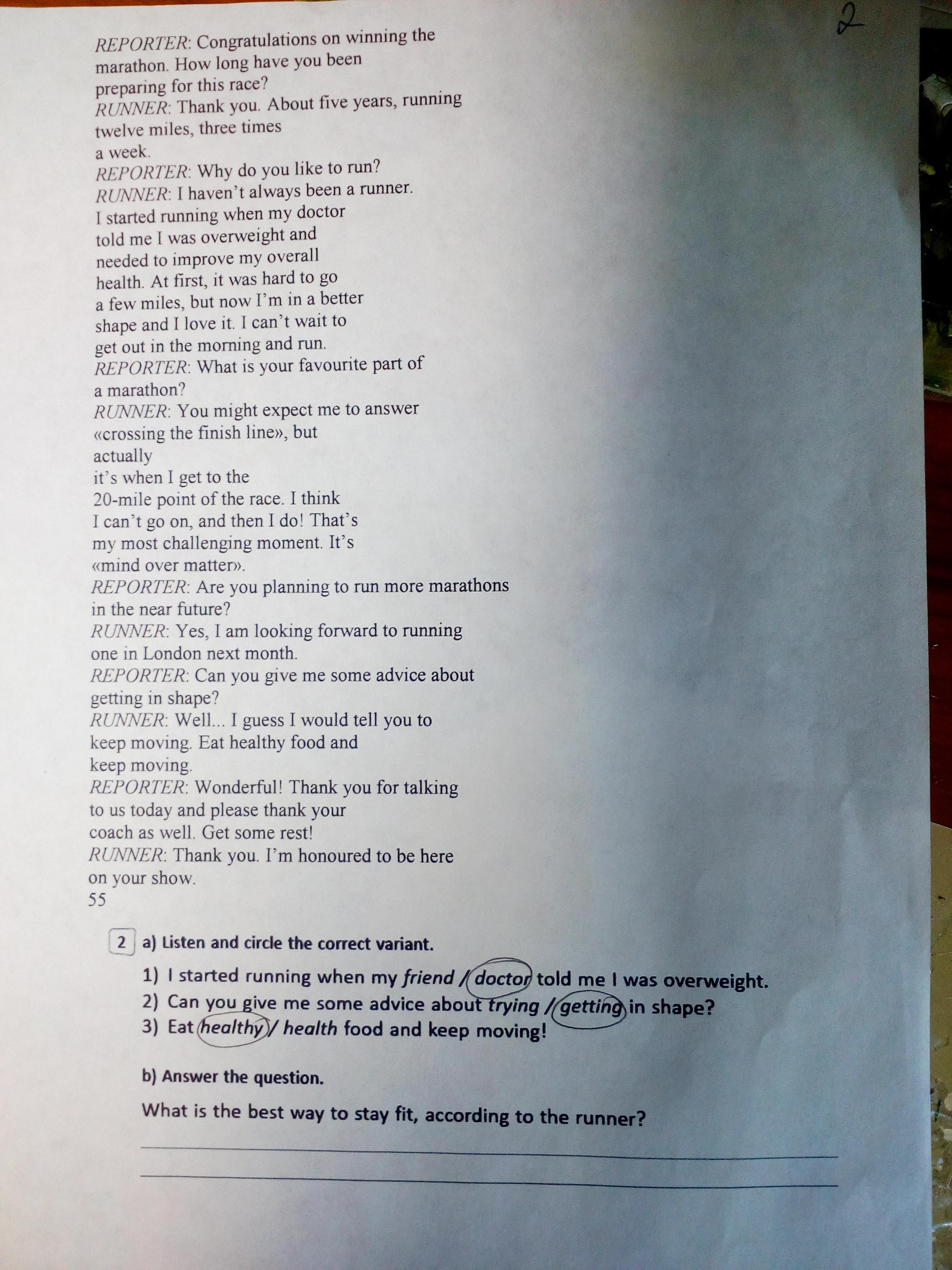 2.b. According to the runner, the best way to stay fit is to eat healthy food and keep moving.