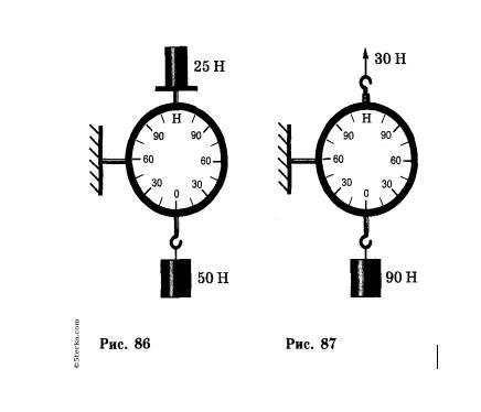 1.Определите показания динамометра на картинке, если две гирьки весом в 25 и 50 Н расположены так: