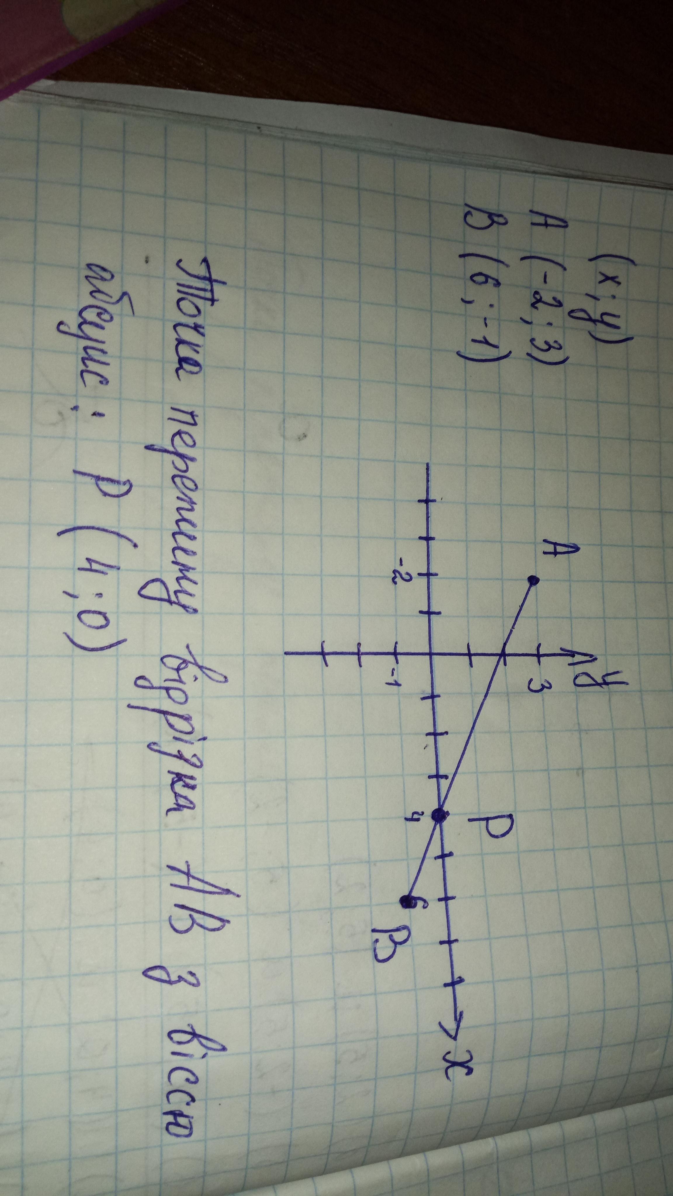 Позначте на координатній площині точки А(-2; 3) і В(6; -1). Проведіть відрізок АВ. Знайдіть координати точки перетину відрізка АВ з віссю абсцис. *