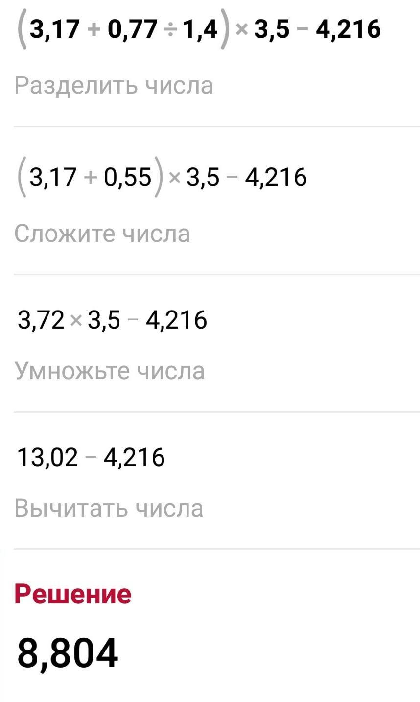 Ответ: (3,17+0,77:1,4)×3,5-4,216