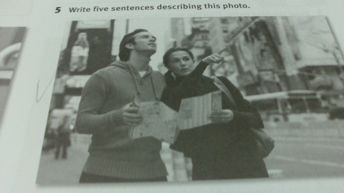 A black and white picture shows a boy and girl. Girl dressed in a black jacket, and a young man - in a gray jumper. They look into the distance, that indicates a girl. They are holding a map, so most likely they were lost and are now looking to get to the desired place for them. Youth are likely looking at a street name or house number, and the girl is looking more massive landmarks.