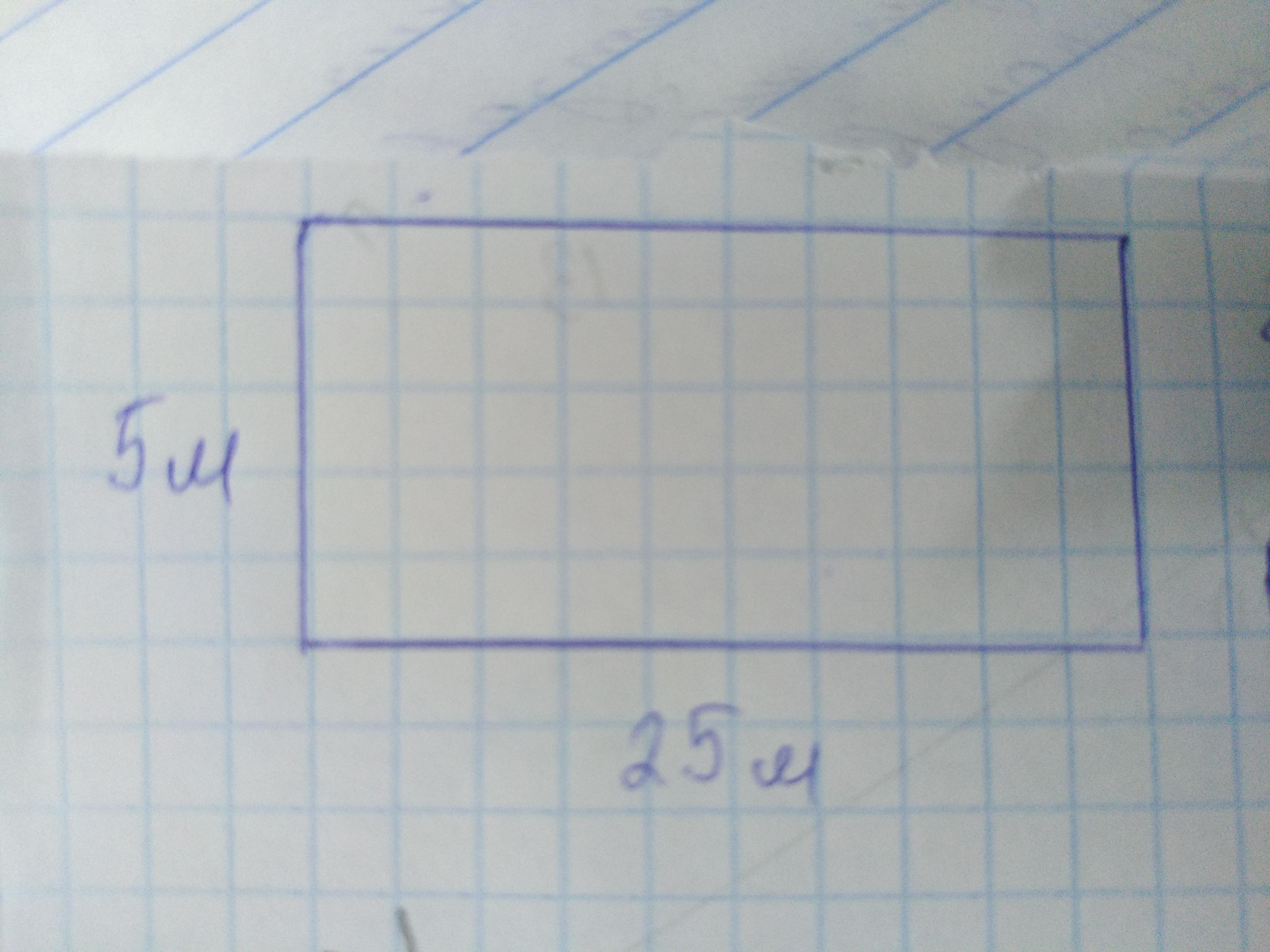 Длинна поля прямоугольной формы 25 м, ширина 5 м. Найди периметр (сумму сторон) этого участка. Напишите на листке подробно и чертежом