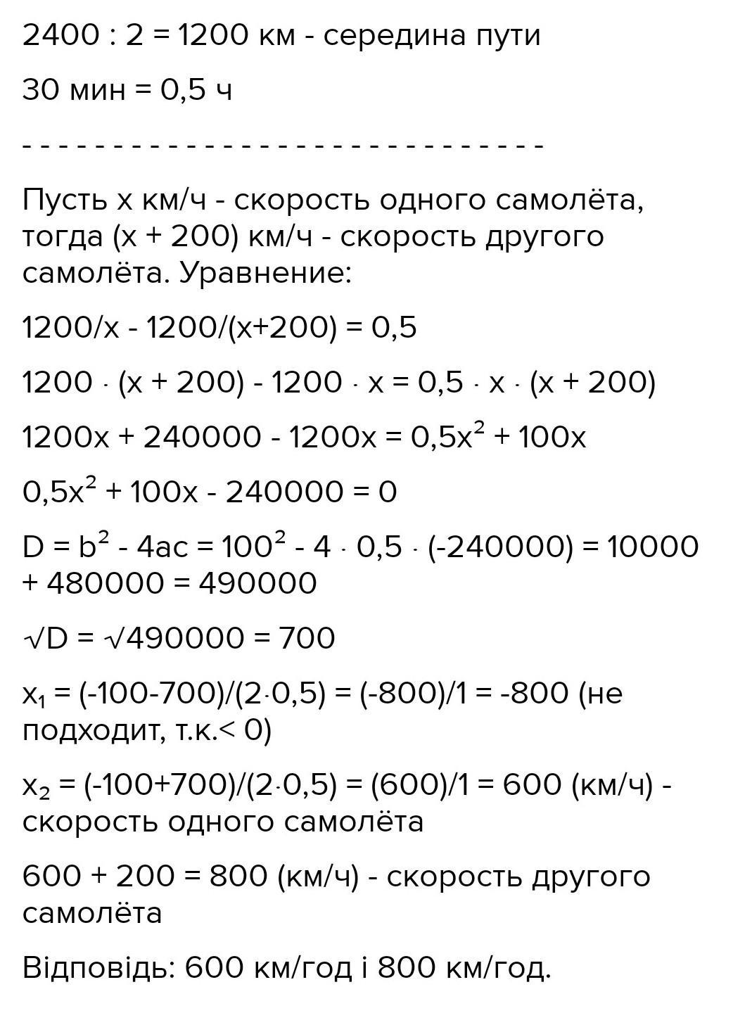 З міста А в Місто В, відстань між якими становить 2400км, вилетів літак. Чкрез 30 хв з міста В до міста А вилетів другий літак, швидкість якого на 200км/год більша за швидкість першого літака. Знайти швидкість кожного літака, якщо вони зустрілися на середині шляху