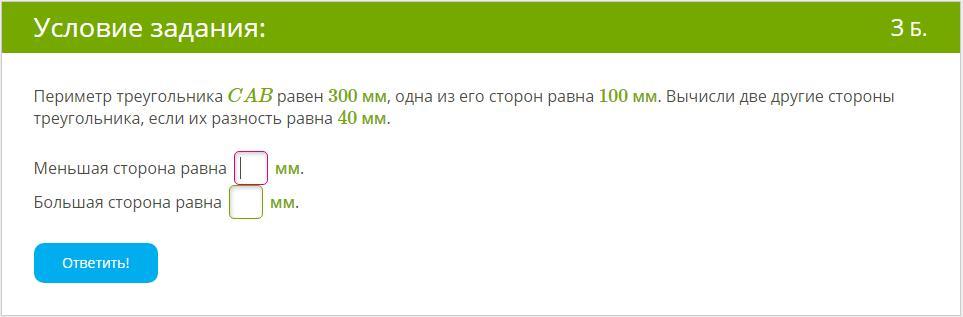 Периметр треугольника CAB равен 300 мм, одна из его сторон равна 100 мм. Вычисли две другие стороны треугольника, если их разность равна 40 мм