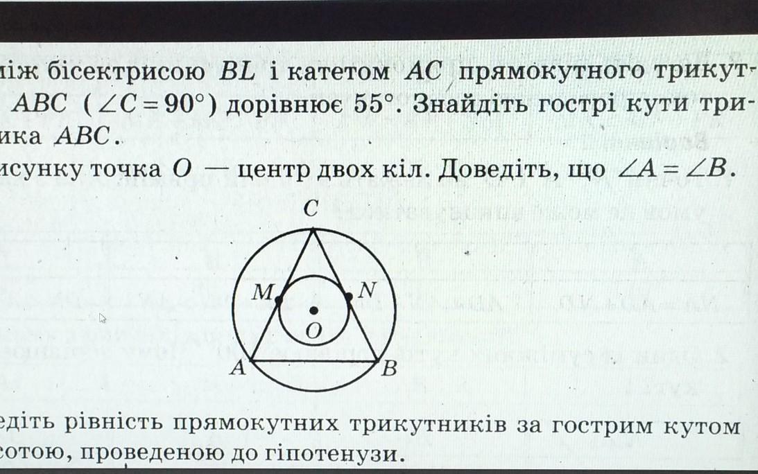 На рисунку видно що сторона N = стороні М, а отже ∆АВС - рівнобедрений, відомо що сума внутрішніх кутів трикутника дорівнють 180°, якщо кутС = 90°, тоді 180°-90°=90° - сума кутів А і В, тоді окремо кут А та кут В = 90°:2=45°..