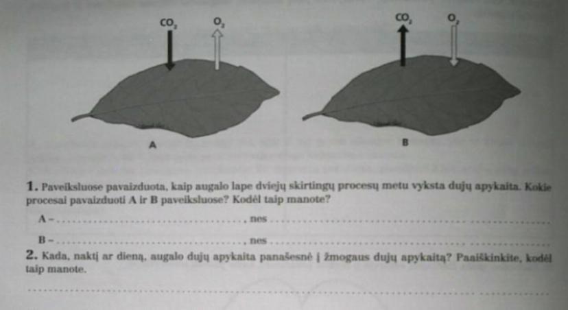 1) На рисунке А - день. Растения поглощают углекислый газ, выделяя при этом кислород. Это процесс фотосинтеза. На рисунке Б - ночь. Растения поглощают кислород, выделяя при этом углекислый газ. Это процесс дыхания.