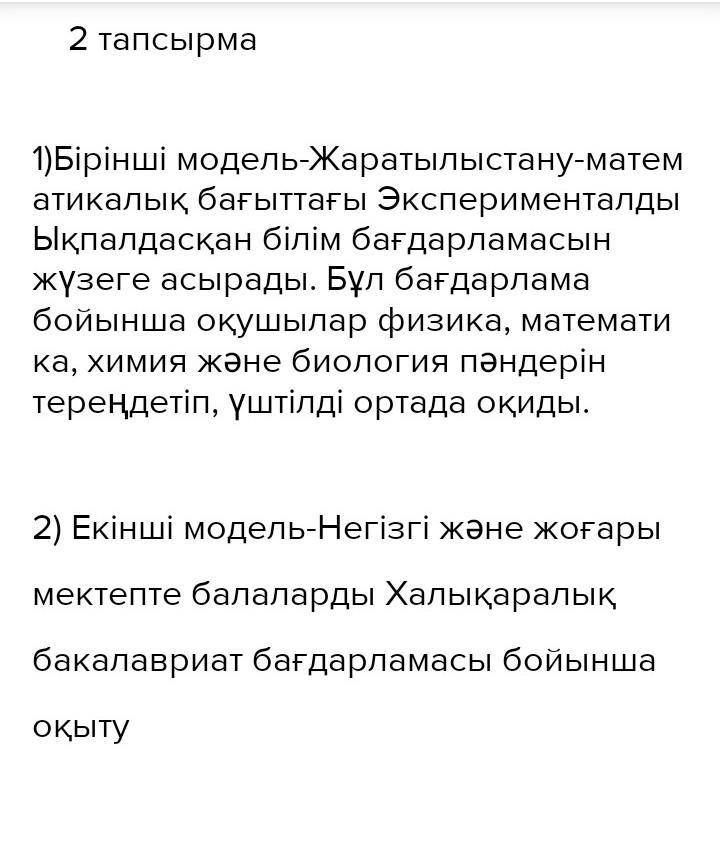 Астана қаласы Зияткерлік мектебі оқушыларының ағылшын тіліндегі математика, физика, химия, биологиядан халықаралық SAT1 емтиханнан қорытынды баллы 1586 құрады, әлемде орташа балл - 1200 (ең көбі -1980 ), ал SAT2 орташа балл - 1720, әлемдегі орташа балл - 1250 (ең көбі - 2200). Ағылшынтілінен IELTS емтиханынан орташа балл - 6,2 (5,7 - өткенжылы). Тек біроқужылыныңішіндехалықаралық, республикалық, облыстықжәнеқалалықолимпиадалардажеңістерекіесекөбейді. Екінші модель - Негізгіжәнежоғарымектептебалаларды Халықаралықбакалавриатбағдарламасы бойыншаоқыту. Бұл 35 жылданастамтарихы бар, жоғарысапалыбілімберетінбағдарламаретіндеәлемгетанылған. Халықаралықбакалавриаттыңдипломын 102 елдің 1300 астамуниверситеттерімақұлдайды.