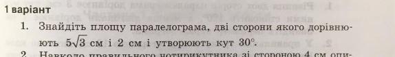 Нужно смежные стороны перемножить на синус угла между ними, т.е. площадь равна 5√3*2*sin30°=5√3*2*0/5=5√3/cм²/