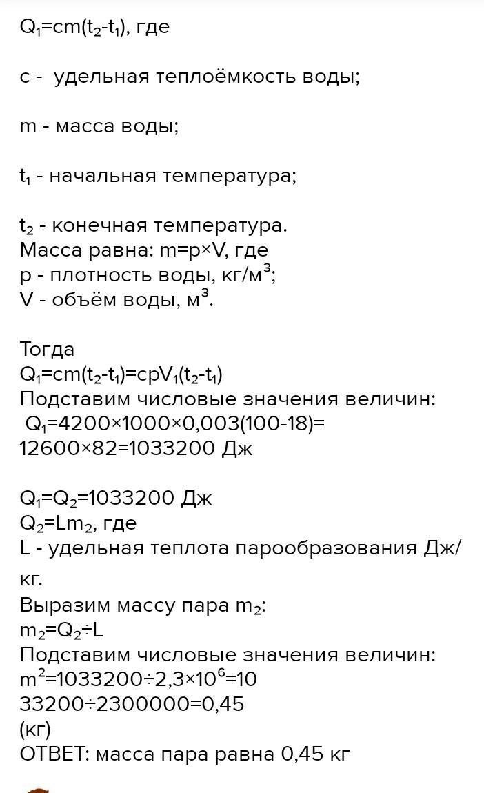 Для нагревания 3 литров воды от 180 °С до 1000 °С в воду впускают стоградусный пар. Определите массу пара. (Удельная теплота парообразования воды 2300000 Дж/кг, удельная теплоемкость воды 4200 Дж/кг · °С, плотность воды 1000 кг/м3).