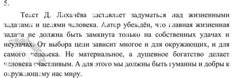 После прочтения текста Д.А. Лихачева можно задуматься над жизненными целями и задачами. Автор уверен что, главная задача не в собственных удачах или неудачах. Выбор цели самое важное в жизни. Счастье не в материальном, а в духовном богатстве. Духовное богатство делает человека счастливым. А для этого мы должны быть добры с окружающими нас людей, уважать и всегда помогать нуждающимся.