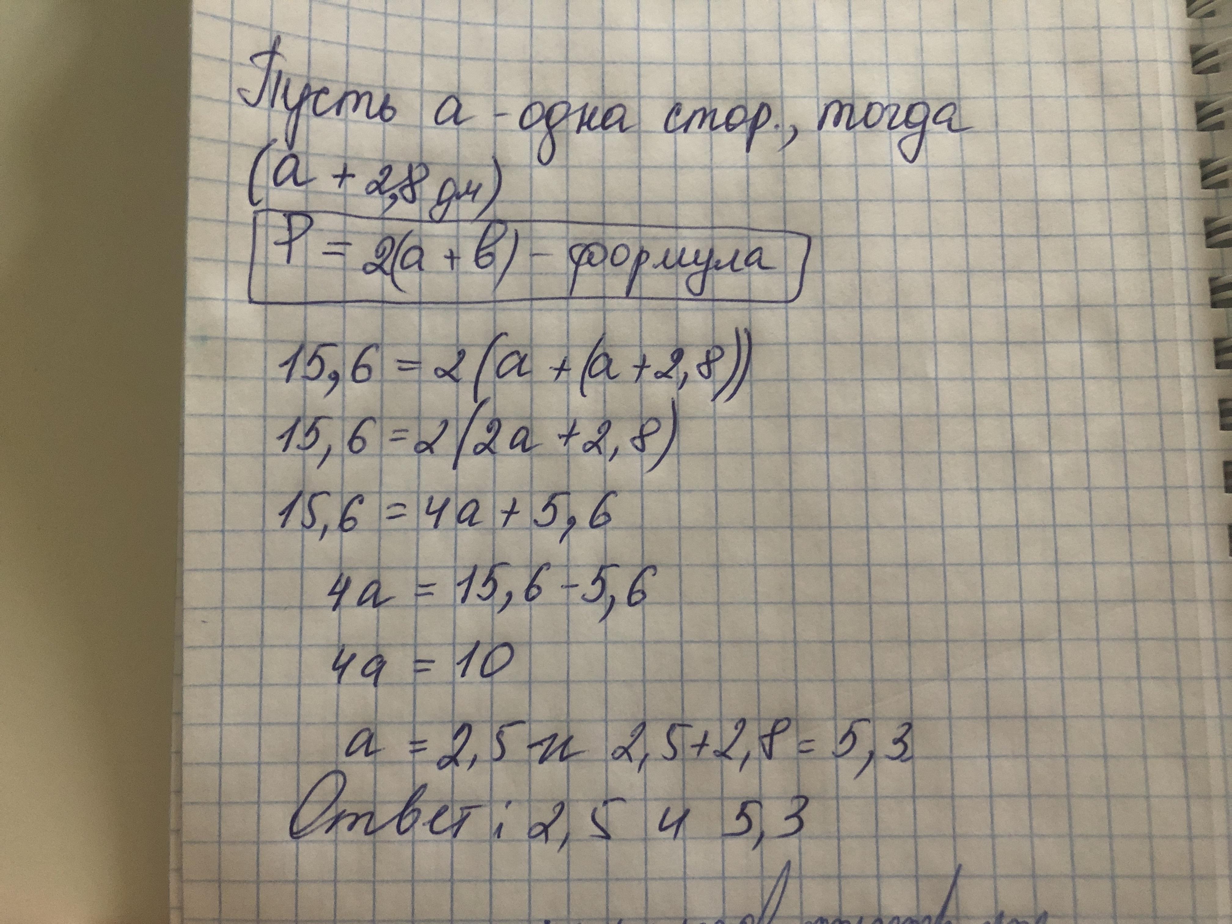 Перемитр прямоугольника равен 15, 6 одна его сторона на 2,8 дм больше чем вторая. чем равны стороны прямоугольника? ПООООЖАЛУЙСТА ОТВЕТЬТЕ ФОТКОЙ