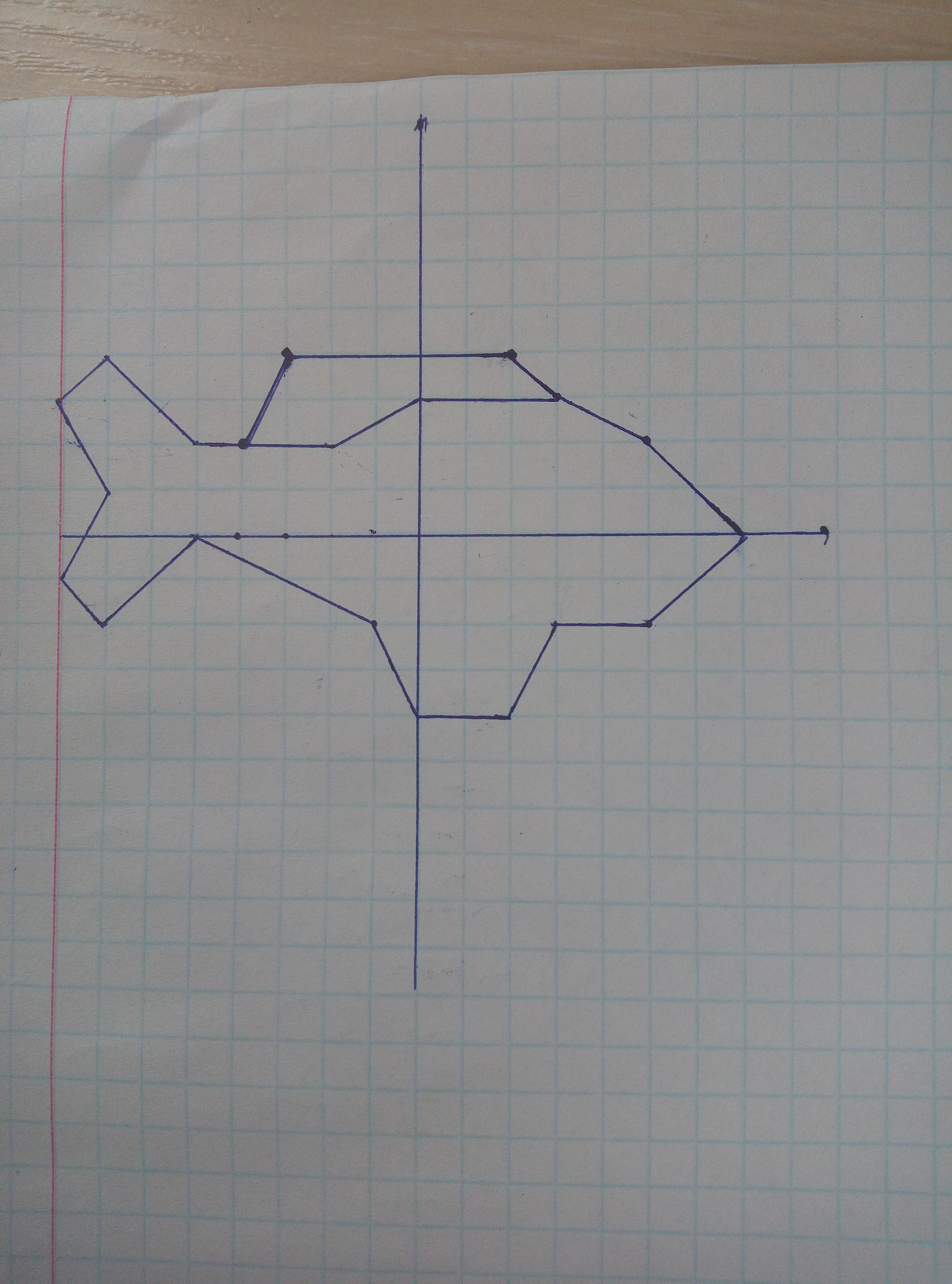 Построить точки в координатной плоскости (-4;2), (-3;4), (2;4), (3;3), (5;2), (7;0), (5;-2), (3;-2), (2;-4), (0;-4), (-1;-2), (-5;0), (-7;-2), (-8;-1), (-7;1), (-8;3), (-7;4), (-5;2), (-2;2), (0;3), (3;3) Соединить точки последовательно.