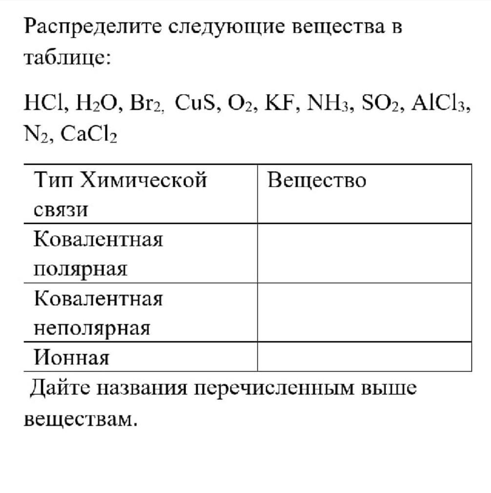 Ионная(металл с неметаллом)- CuS, KF, AlCl3, CaCl2