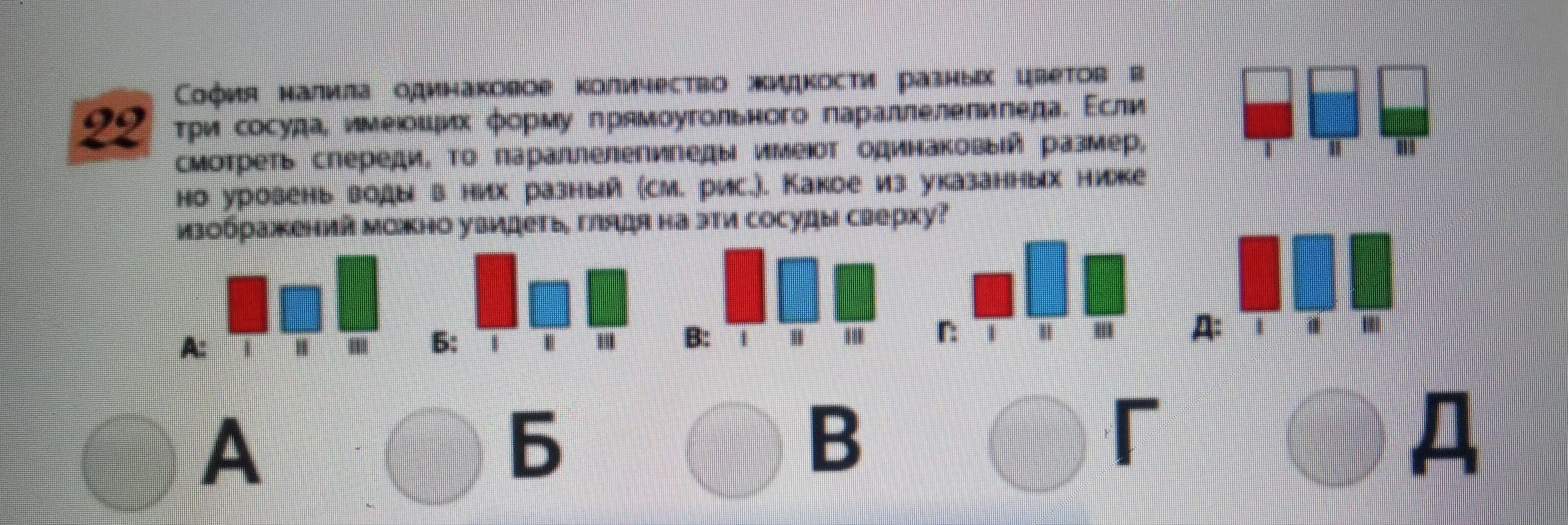 ответ д верный,смотря сверху не видно сколько налито жидкости,видно только что они там есть и будет казаться что жидкости там одинаковое количество.