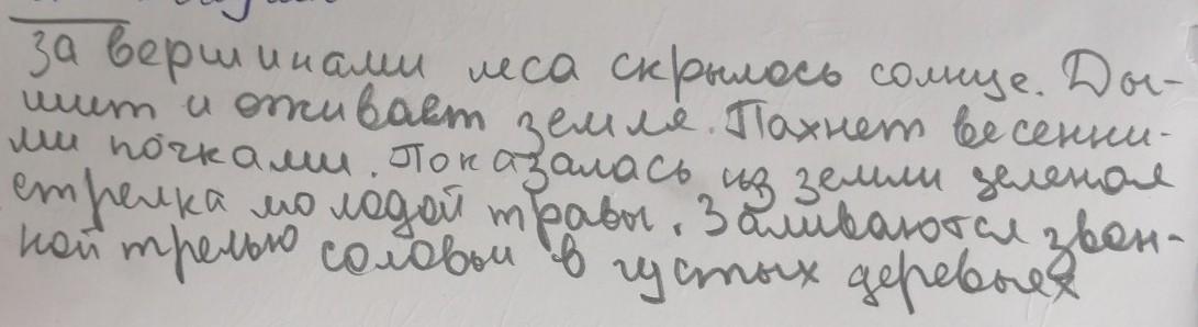 За вершинами леса скрылось солнце. Дышит и оживает земля. Пахнет весенними почками. Показалась из земли зелёная стрелка молодой травы. Заливаются звонкой трелью соловьи в густых деревьях.