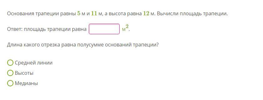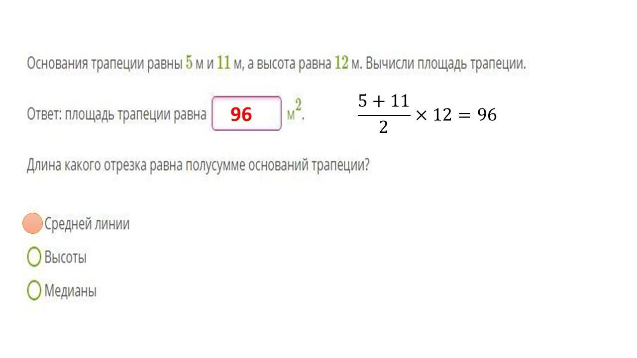 2)S=(a+b)/2*h=(5+11)/2*12=96кв.м