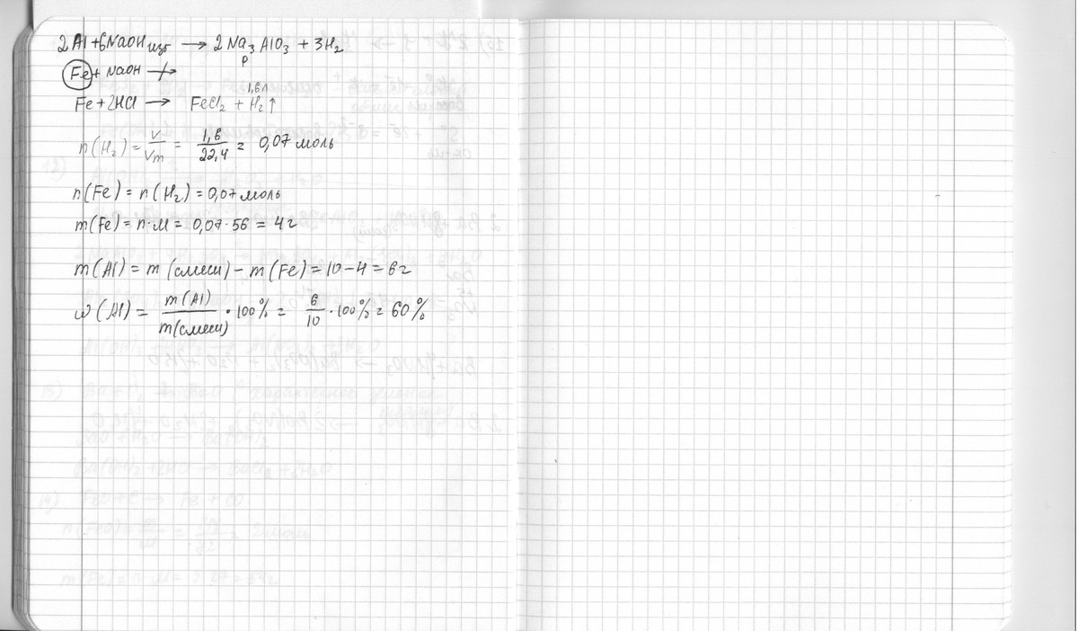 К 10 г смеси алюминиевых и железных опилок добавили избыток NaOH.Оставшийся осадок был отфильтрован,высушен в растворе HCL,при этом выделилось 1,6 л водорода. Определите процентное содержание алюминия в смеси.