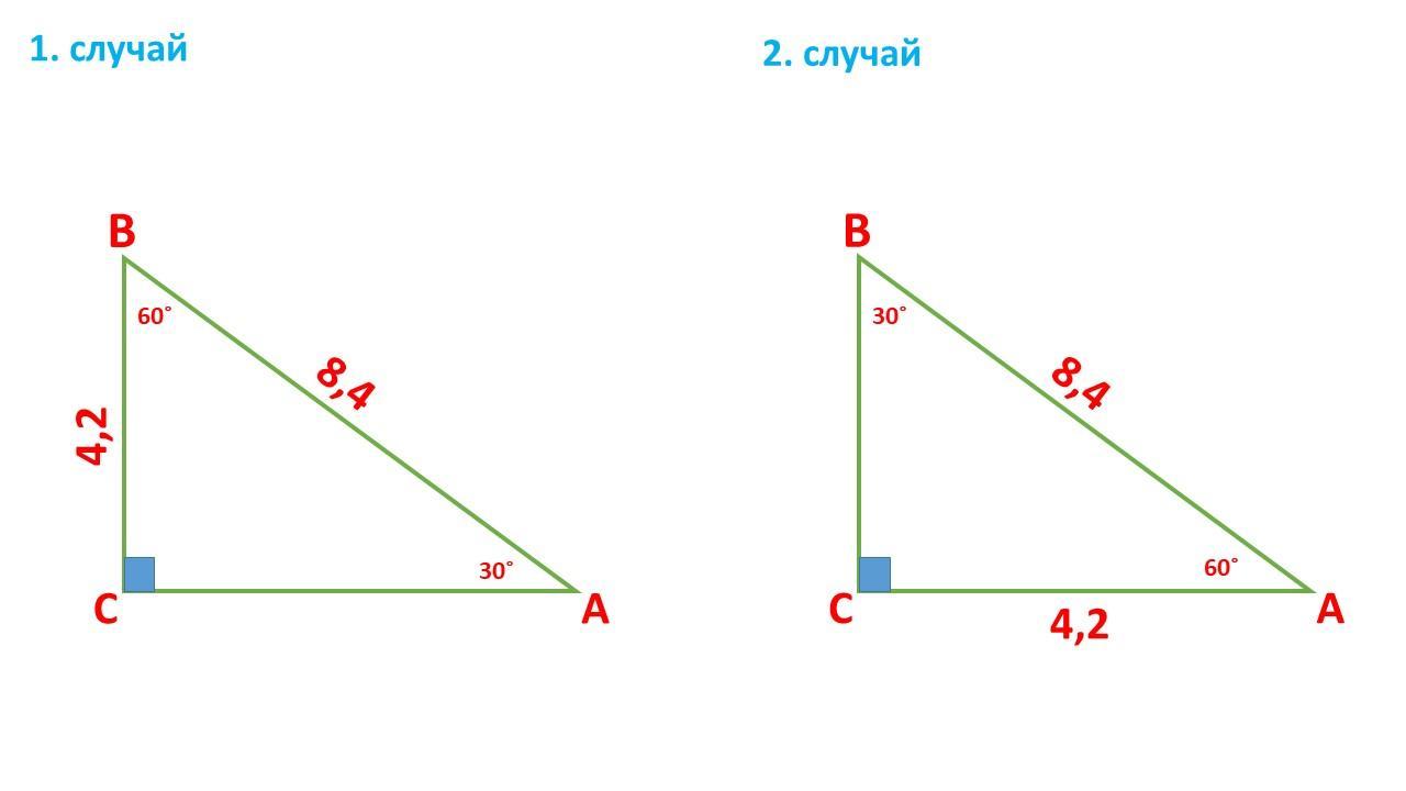 треугольник ABC угол C 90 градусов катет 4,2 см гипотенуза AB 8,4 см найти угол A и B