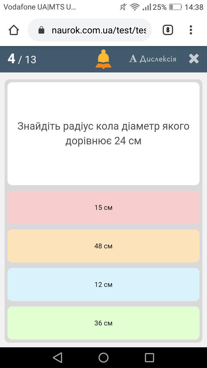 Знайдіть радіус кола діаметр якого дорівнює 24 см. Варіанти відповіді: 15 48 12 36