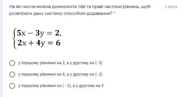 На які числа можна домножити ліві та праві частини рівнянь, щоб розв′язати дану систему способом додавання? *