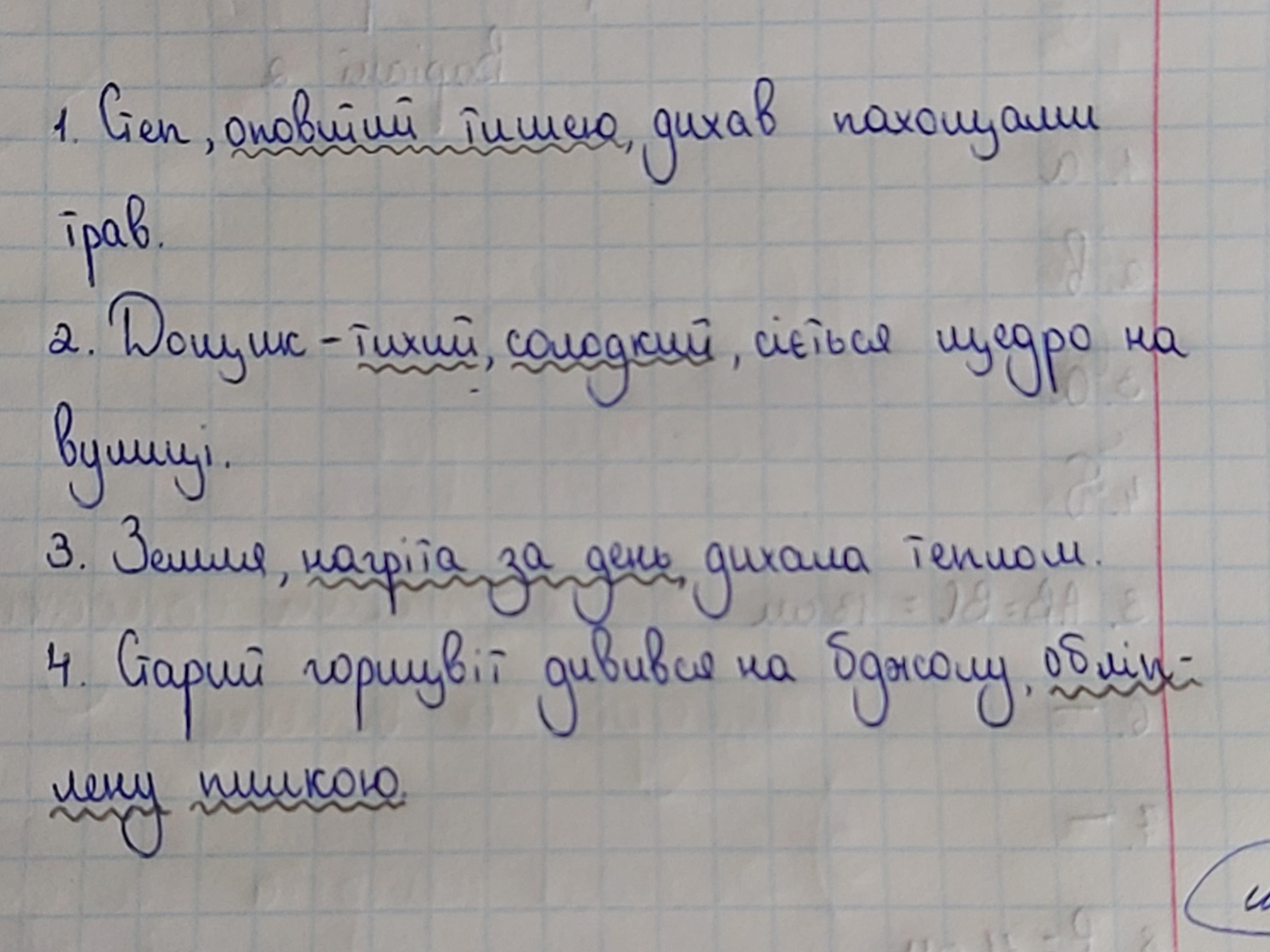 ПОМОГИТЕ ПОЖАЛУЙСТА Я ВООБЩЕ НЕ ЗНАЮ перебудуйте подані речення у речення з відокремленими означеннями,підкресліть їх, поставте розділові знаки: Оповитий тишею степ дихав пахощами трав. Тихий солодкий дощик сіється щедро на вулиці. Нагріта за день земля дихала тепло. Старий горицвіт дивився на обліплену пилкою бджолу ПОМОГИТЕ ПОЖАЛУЙСТА 8 клас