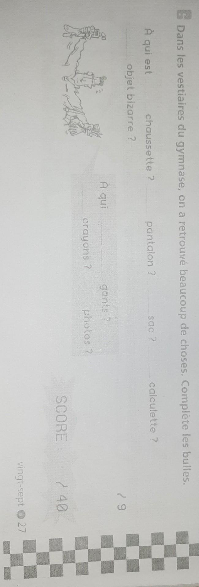 A qui est la chaussette ? le pantalon? le sac? la calculette? l'objet bizarre?